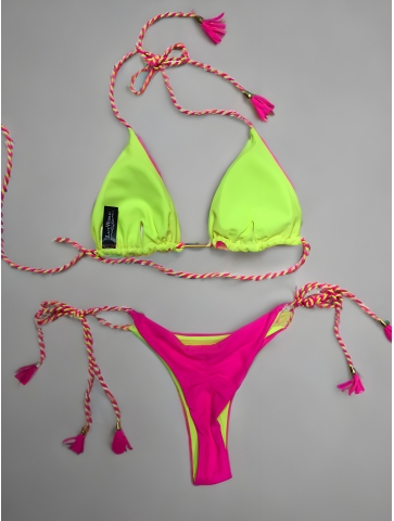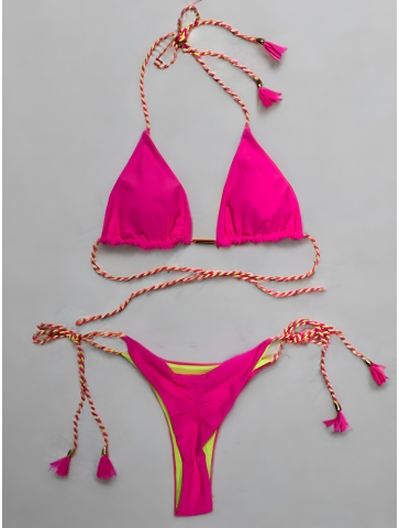 Costum de baie brazilian roz fucsia cu snururi colorate si slip reglabil. Model reversibil roz si verde neon, cu sutien triunghi si talie medie, ideal pentru plaja sau piscina.