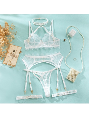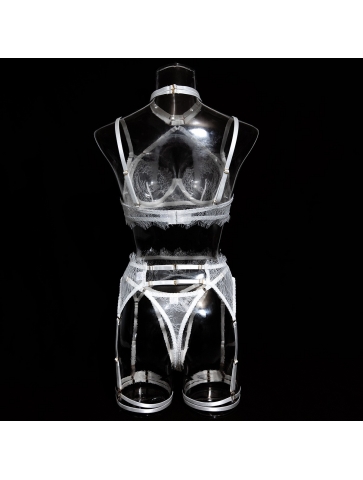 Setul contine sutien, chilot, jartiere si accesoriu gat.