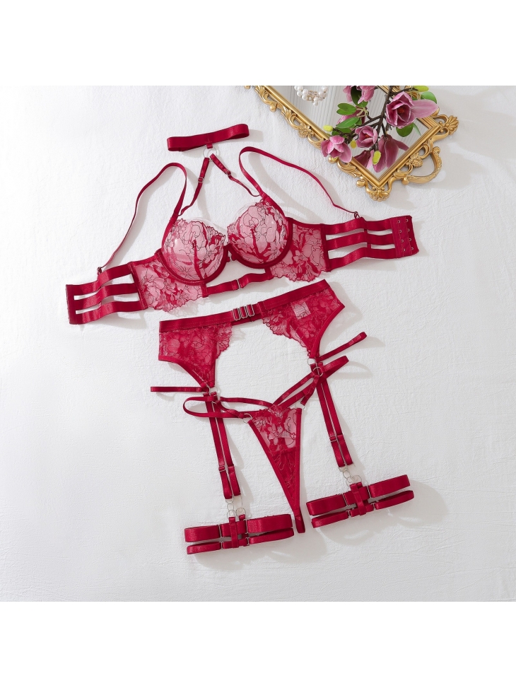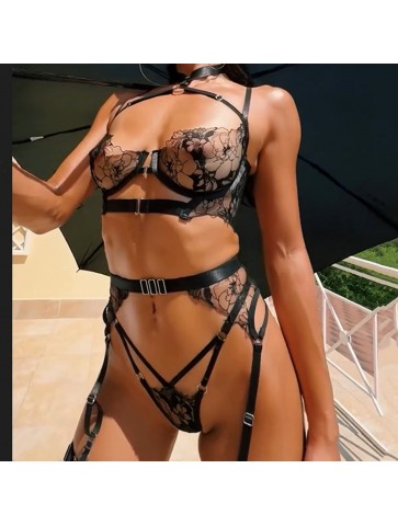 Setul contine sutien, chilot, jartiere si accesoriu gat.