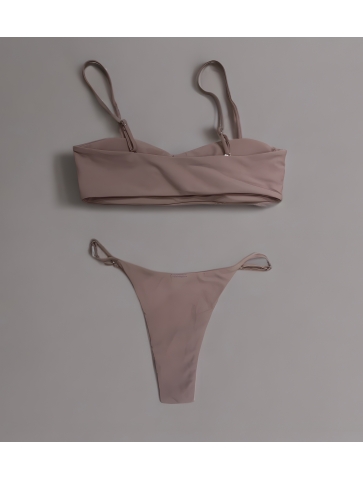 Costum de baie nude cu slip brazilian reglabil si sutien bandeau cu aplicatii stralucitoare. Material elastic, confortabil si elegant, perfect pentru plaja sau piscina.